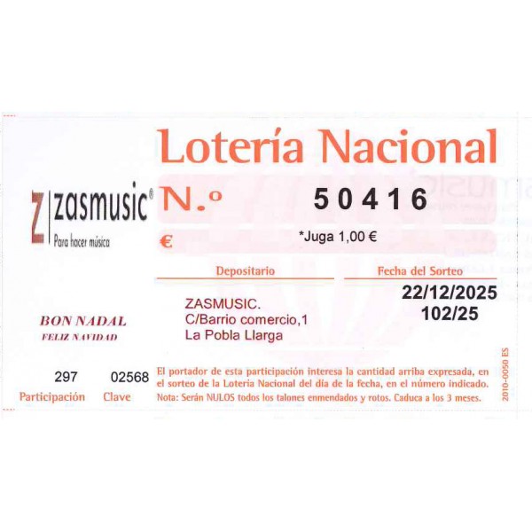 ZASMUSIC, S.L. REGALA a los 300 pedidos primeros (con un importe mínimo de 35 euros y solo por cada pedido) que se efectúe en nuestra web www.zasmusic.com o por e-mail a ventas@zasmusic.com o por teléfono al 962591276 entre el 06/11/2024 y el 20/12/2024, 1 euro de lotería nacional, número 50416 para el sorteo que se ha de celebrar el día 22 de diciembre de 2024 (sorteo extraordinario de navidad) En el caso de ser agraciado el número 50416 (pueden consultar los premios por serie en la web de loterías y apuestas del estado) el cliente (usted) deberá enviar a ZASMUSIC, S.L. una carta (certificada) con la papeleta agraciada (original, cuñada por ZASMUSIC, S.L.) y la referencia del pedido que ZASMUSIC, S.L. le otorgó, con todos sus datos personales (que siempre deben coincidir con los datos de facturación del pedido formulado) y cuenta bancaria para realizar el ingreso del total de su premio (no antes de que Lotería Nacional ingrese a ZASMUSIC, S.L. el total del premio y menos los impuestos vigentes). Por la comisión que pueda cobrar la entidad bancaria en el momento de efectuar la transferencia a la cuenta que nos indique el cliente, ZASMUSIC S.L. se reserva el derecho de ingresar la diferencia entre el total del importe y la posible comisión que pueda aplicar el banco. En el caso de ser agraciado el número 50416 en el sexto premio o en las aproximaciones del tercer premio o por toda la resta de premios menores el importe de su premio será descontado en el primer pedido que efectúe en ZASMUSIC, una vez Lotería Nacional ingrese a ZASMUSIC, S.L. el total del premio. Si el precio es REINTEGRO se volverá a jugar el mismo importe para el sorteo del niño de 2025 En el caso de error tipográfico o de cálculo, los premios a pagar a cada cliente por el 1 € regalado serán los que otorgue a ZASMUSIC, S.L. Lotería Nacional por los décimos adquiridos y no los que aparecen en este escrito mal calculados o escritos. Ningún cliente podrá reclamar a ZASMUSIC, S.L. el pago del premio que Lotería Nacional otorgue al número 50416 sin presentar la papeleta original (en buen estado, no rota) como se ha señalado anteriormente aunque presente una papeleta original en buen estado pero su nombre no sea el del pedido que se formuló para poder regalar la participación que presente aunque haya formulado un pedido entre las fechas señaladas al principio de este documento pero se hayan terminado las 300 participaciones de 1 € el pago del premio antes de que Lotería Nacional haya efectuado el pago a ZASMUSIC, S.L.. Con este regalo, ZASMUSIC, S.L. pretende agradecer a todos sus clientes la confianza que depositan en esta empresa