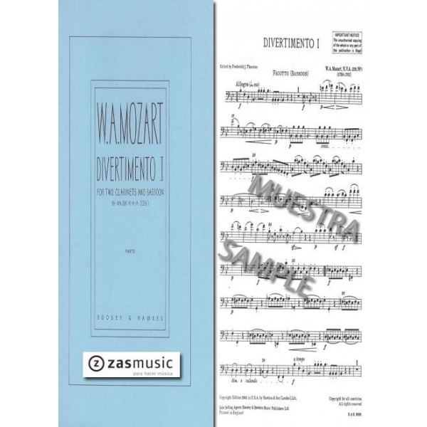 Mozart, Wolfgang Amadeus (1756-1761): Divertimento I fot two clarinets and bassoon Bb MAJOR KVA 229/1 Ed. Boosey & Hawkes. Se trata de las partes.