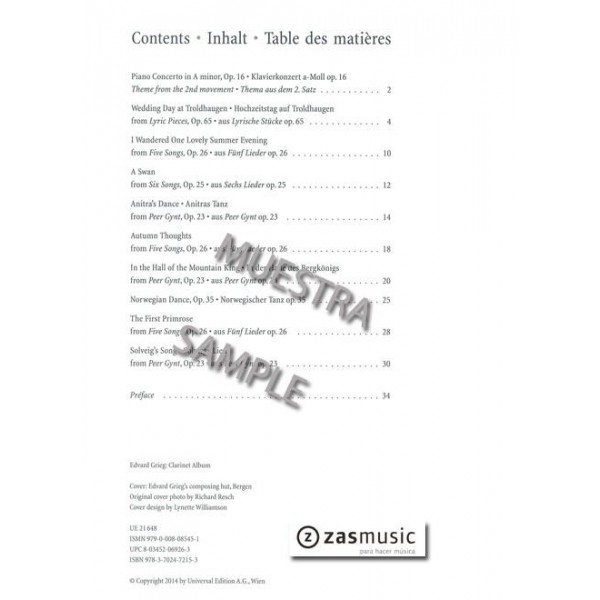 Grieg, Edward: Clarinet Album. Arreglo de James Rae para clarinete sib y piano. Contiene diferentes obras con diferente intensidad Ed. Universal Editions. ISBN 978-3-7024-7215-3.