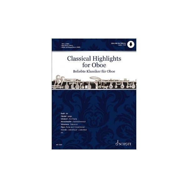 "Classical Highlights" presenta las piezas interpretativas más conocidas y populares del repertorio clásico en arreglos para oboe y piano. La extensa selección de literatura brinda acceso a las obras maestras clásicas de Handel y Bach, Schubert, Mendelssohn, Schumann y Wagner hasta Fauré, Elgar, Debussy y Satie. Todo oboísta que busque un clásico popular para una clase o actuación encontrará algo aquí. Pero también hay un repertorio adecuado para el acompañamiento musical de bodas y funerales. Para facilitar la práctica, las pistas de acompañamiento se pueden descargar como archivos MP3. El acompañamiento de piano está disponible como PDF.