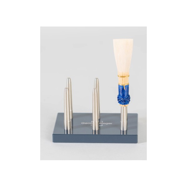 Tabla de secado para 6 cañas de contrafagot, fijada sobre una base de aluminio arenado y revestido. Mandriles de alpaca.