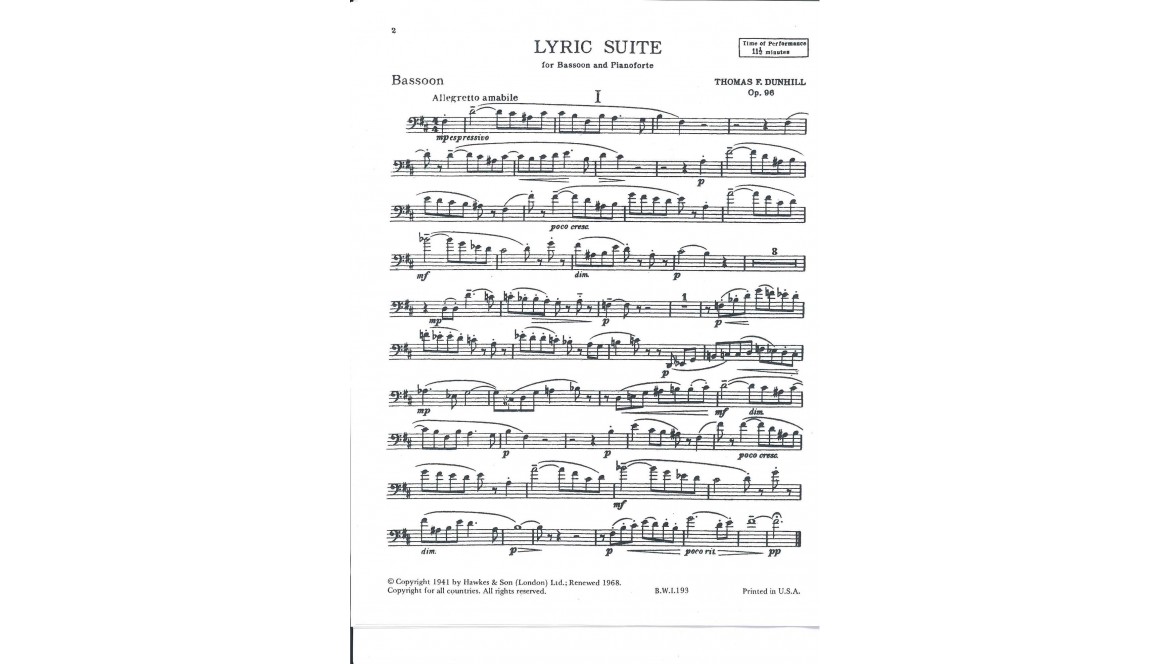 Del compositor, Thomas Frederick Dunhill (1877-1946) tenemos a la venta en zasmusic, su obra Lyric Suite para fagot y piano. Esta obra, publicada por Boosey & Son (Londres) en 1941, actualmente editada por la Boosey & Hawkes con ISMN M-060-01902-9, se compone de 5 movimientos (Allegretto amabile; Scherzino, alloegro molto, giocoso; Nocturne, andente con moto, grazioso; itermesso alla gavotta, animato; capriccioso assai) no superando ninguno de los tiempos las 3 alteraciones en su tonalidad, sin semicorcheas y sin clave de do en cuarta (todo en clave de fa en cuarta). El primer tiempo, un 4 por 4, está escrito en Re M (dos sostenidos en la armadura) llegando a un sib como nota más aguda (si b 4 del fagot, tomando como el si b grave como 1). El segundo tiempo en 3 por 4, tiene solo un sostenido en la armadura (Sol M) no superando el sol 3 del fagot. En este segundo tiempo aparecen notas de adorno, en concreto mordentes de una nota (hay dos) y un grupeto de tres notas (dos en todo el tiempo). El tercer tiempo, en 9 por 8, tiene tres bemoles (Mi b M) y no supera el la b 3 del fagot. En 4 por 4 está compuesto el cuarto tiempo y con un solo bemol en la armadura (Fa M). Este cuarto tiempo no supera, en tesitura, el la 3. Y por último el quinto tiempo, en 6 por 8, empieza con dos sostenidos en la armadura (Re M) pero pasa a un 2 por 4 y a 3 sostenidos (La M), volviendo a la primera tonalidad y compás antes de finalizar. Este último tiempo, la nota más aguda que hace es el la 3. Cada uno de los tiempos ocupa solo una página de un A4, y se señala que 11 minutos dura la interpretación de toda ella.